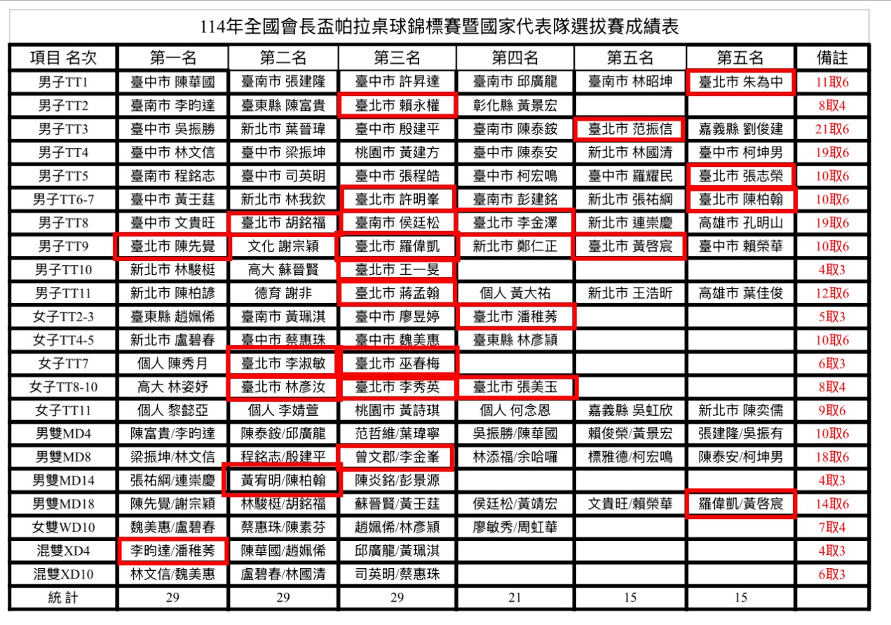 114年全國會長盃帕拉桌球錦標賽暨國家代表隊選拔賽